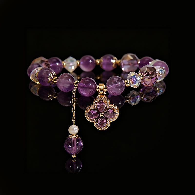 The combination of purple crystals and four-leaf clover charms strengthens self-confidence, intuition, and charm. It encourages balance between personal and emotional energy, boosting inner poise while inviting opportunities for romance and positive encounters.