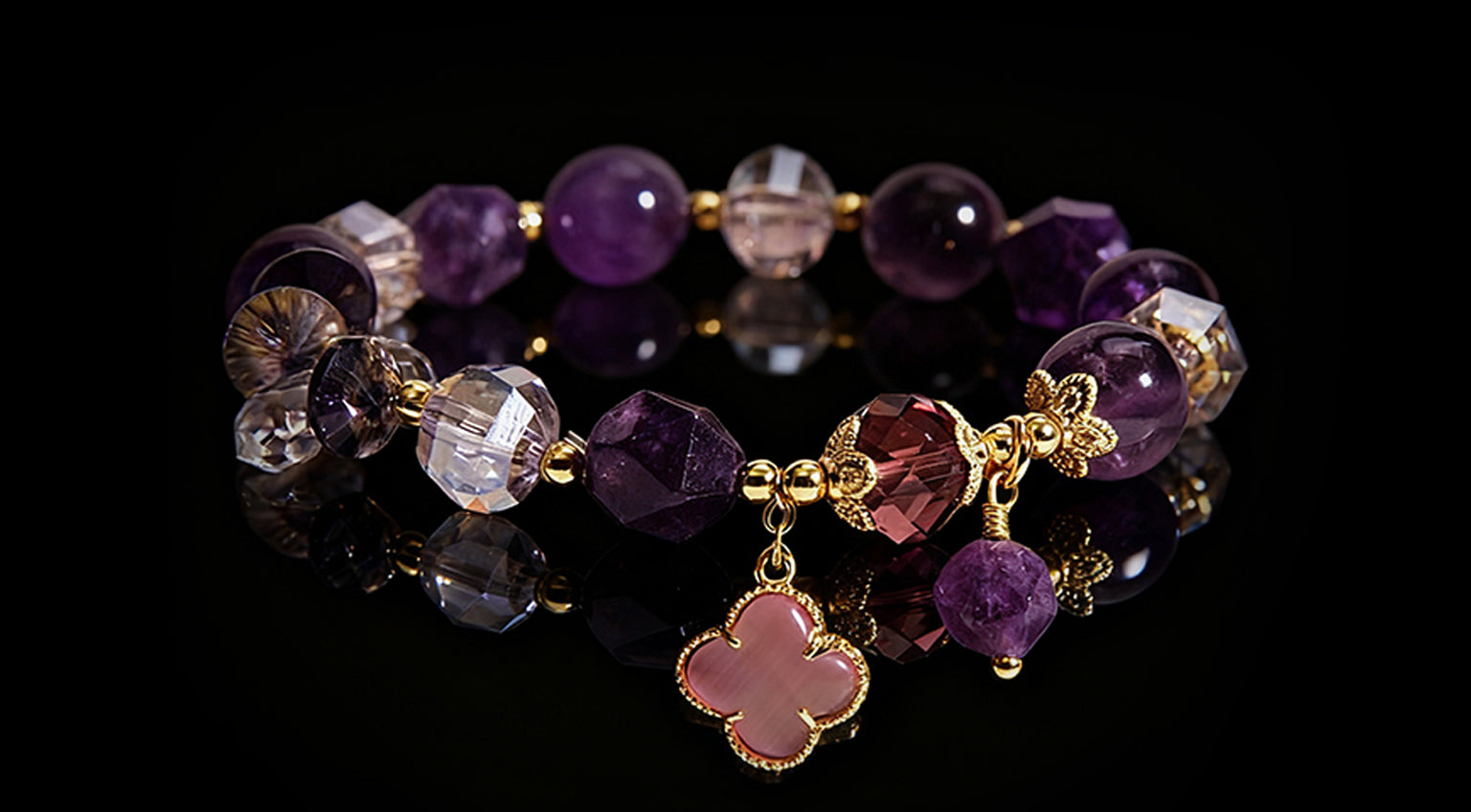 Natural Amethyst Bracelet with Heart & Clover Accents – Luxury Women’s Jewelry