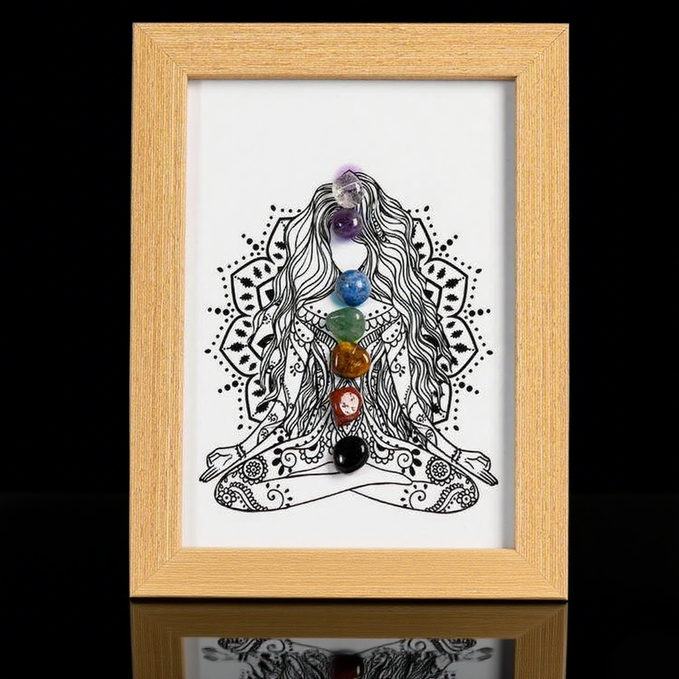 This Seven Chakra Crystal Tree Decorative Frame combines seven chakra crystal trees with natural raw stones, each tree corresponding to a chakra energy center and arranged in a harmonious artistic display.
