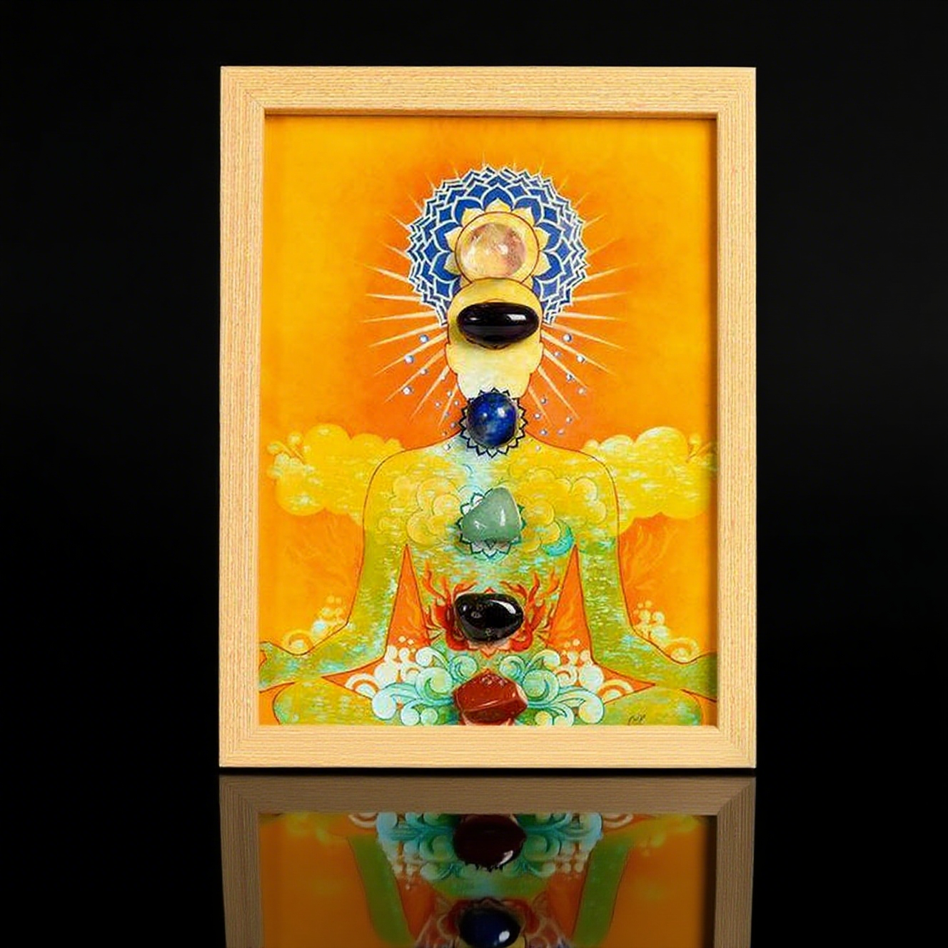 This Seven Chakra Crystal Decorative Frame – Desktop Stand features a colorful yellow human chakra illustration as its centerpiece, combined with seven natural raw crystals to form a unique energy frame.