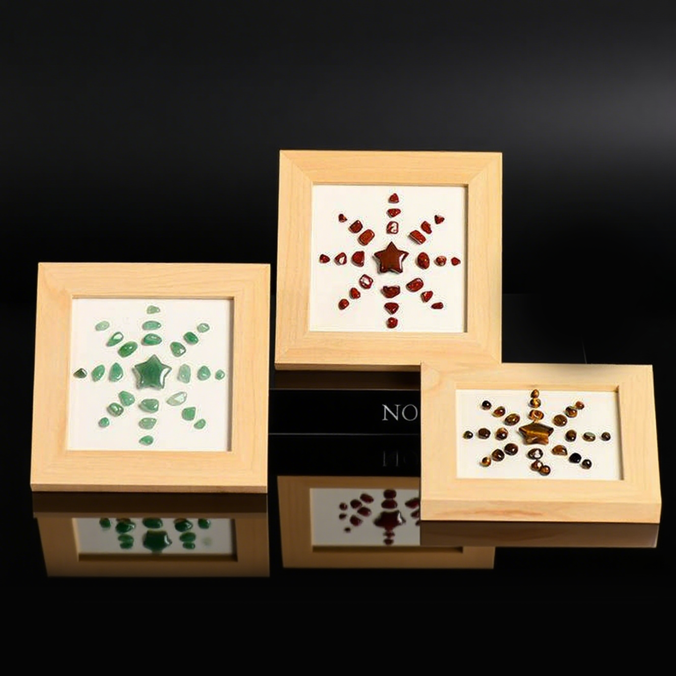 This elegant crystal frame combines the radiant energy of a solar flower with the symbolic pentagram, handcrafted from natural crystals. It radiates positivity, protection, and harmony, making it both a stunning decor piece and a spiritual energy tool.